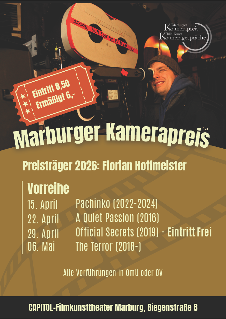 Am 15. April 2026 um 19:30 Uhr ist es soweit: Die Vorreihe des Marburger Kamerapreises beginnt. Bis zum 06. Mai werden jeweils mittwochs um 19:30 Uhr im Capitol Filmkunsttheater Marburg Filme und Serienfolgen unseres diesjährigen Preisträgers Florian Hoffmeister gezeigt.
